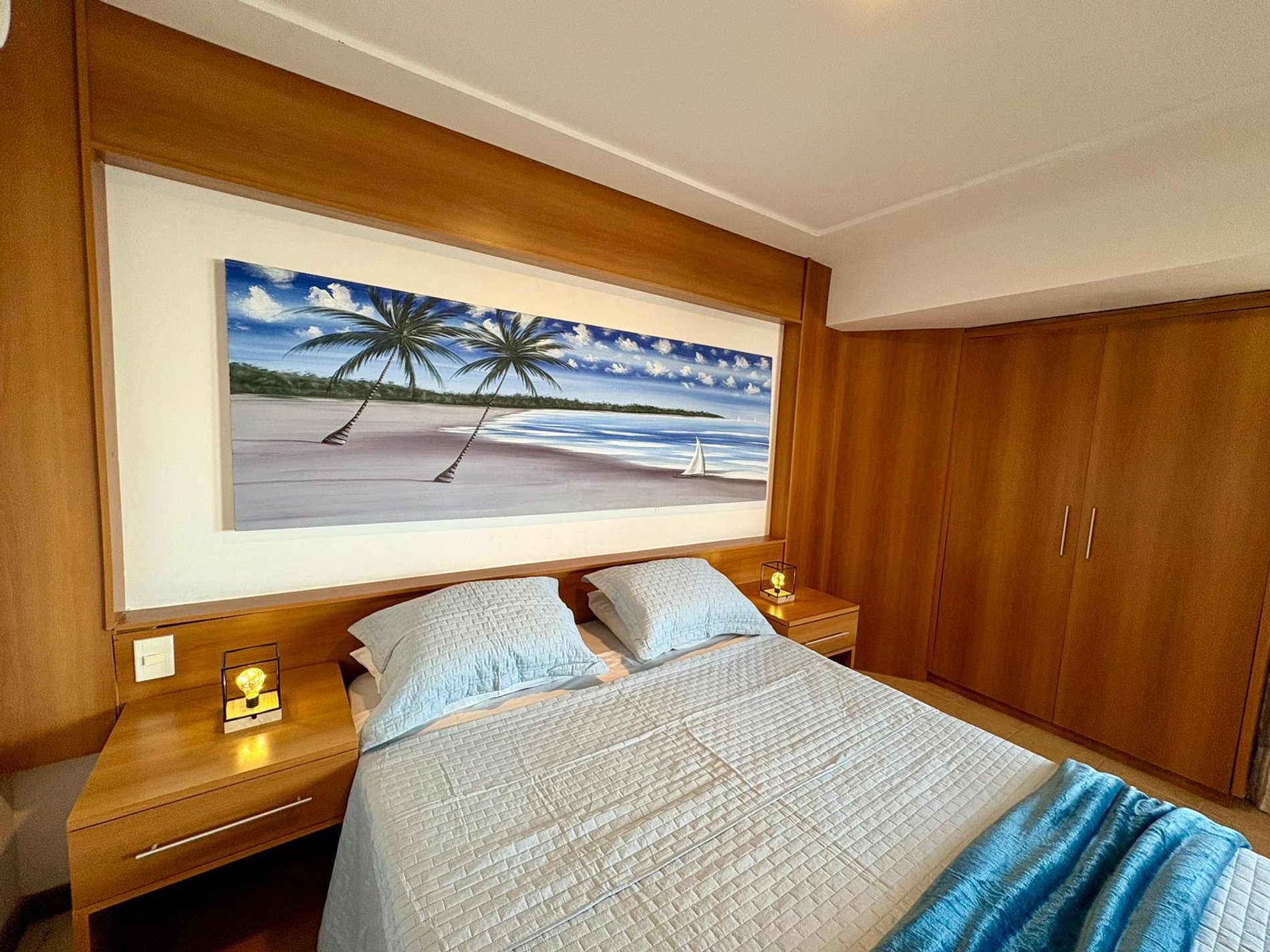 Ideal para casais ou viagens a trabalho, o ambiente é aconchegante, bem iluminado e com decoração praiana.