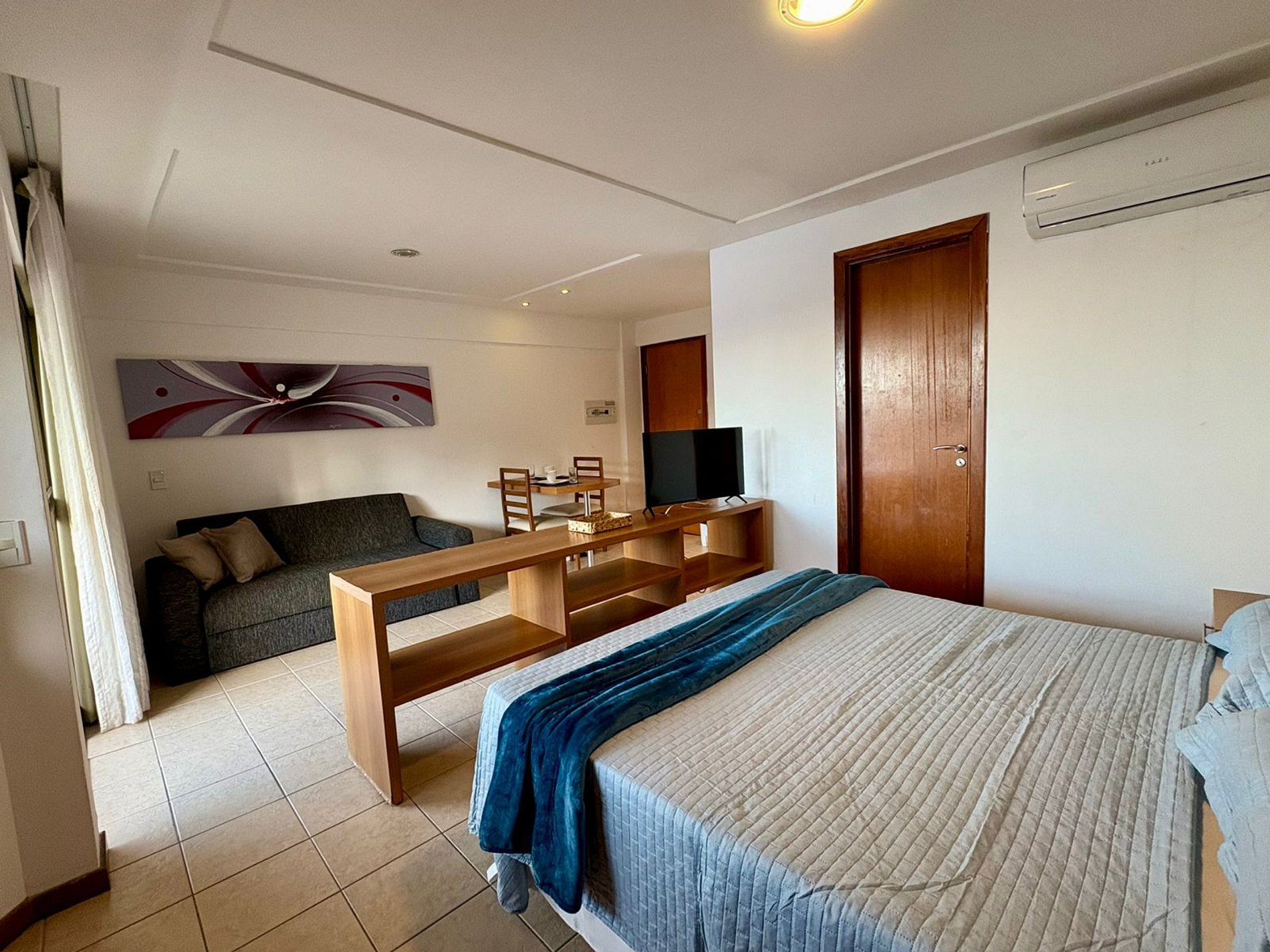 Ideal para casais ou viagens a trabalho, o ambiente é aconchegante, bem iluminado e com decoração praiana.