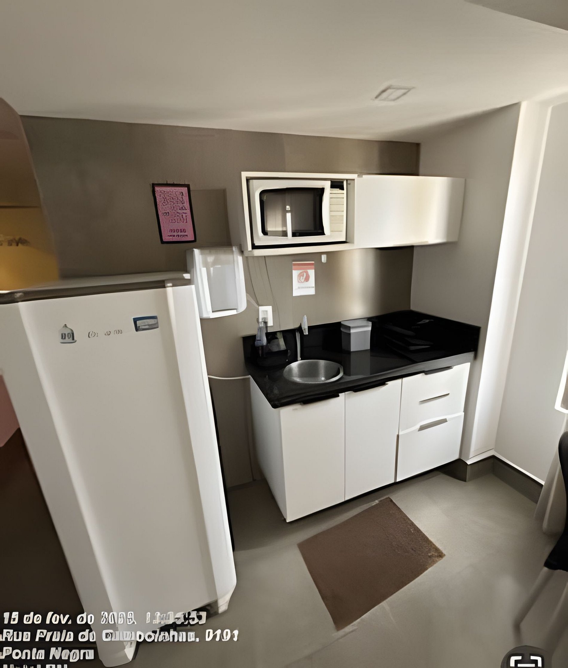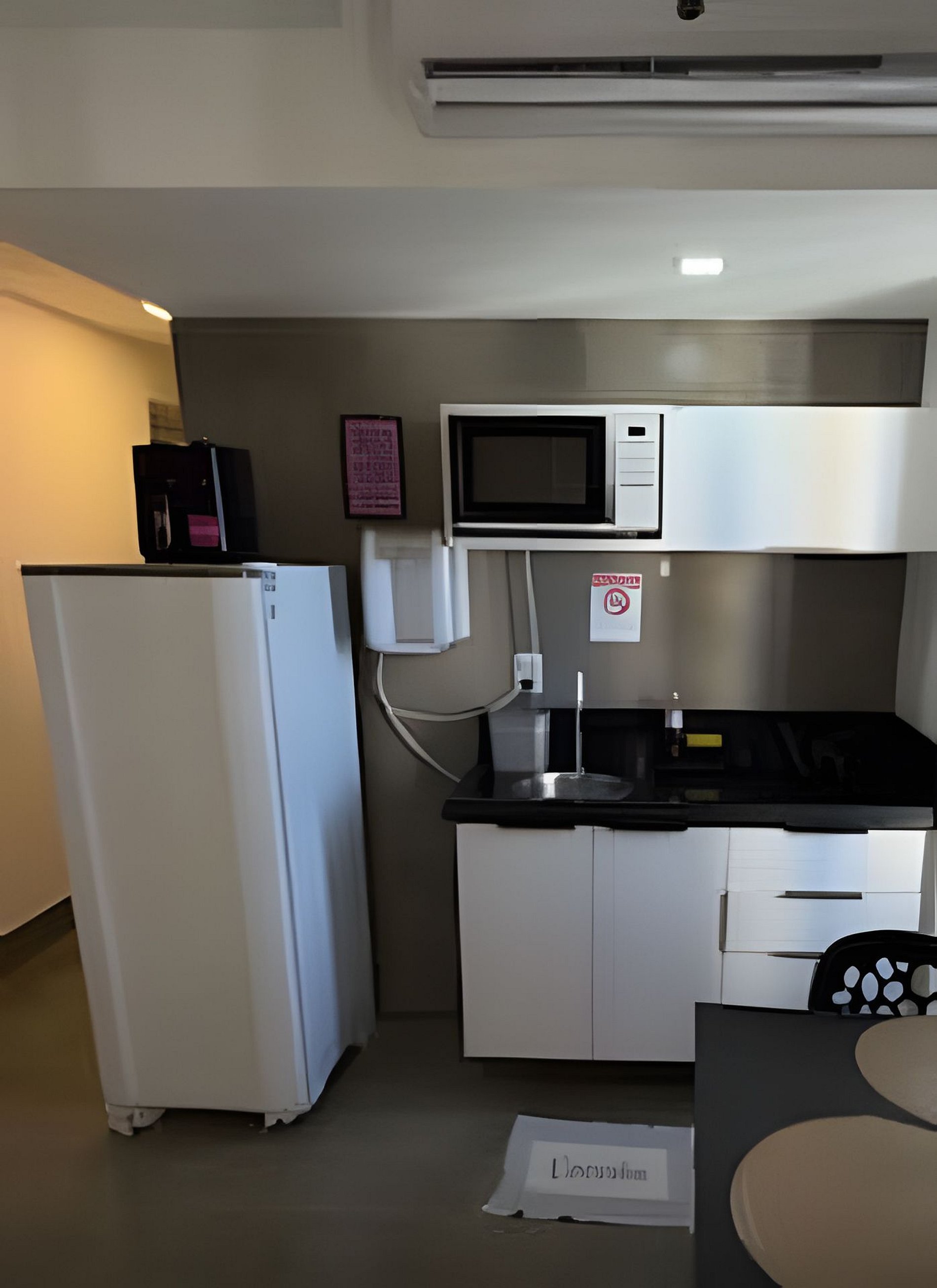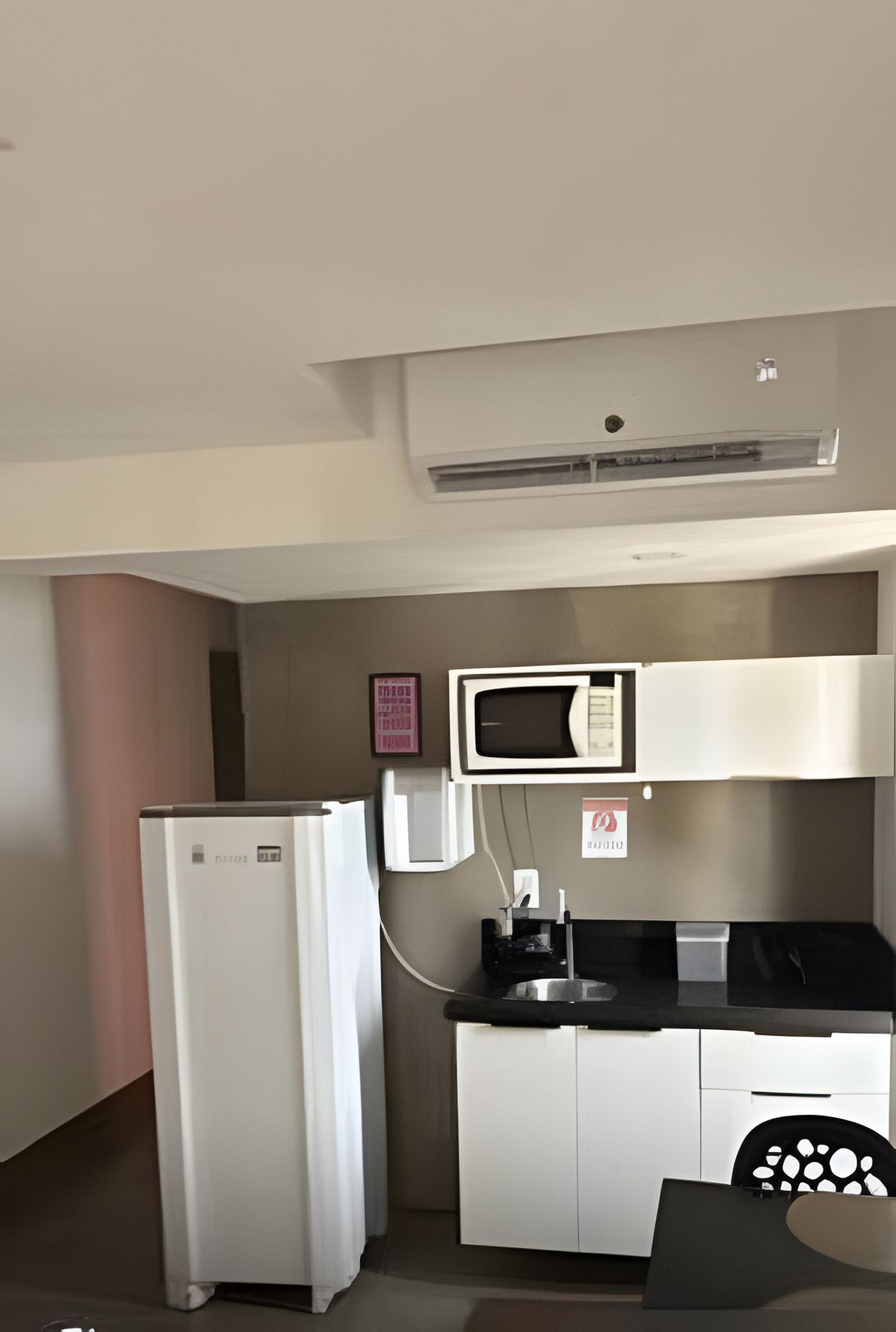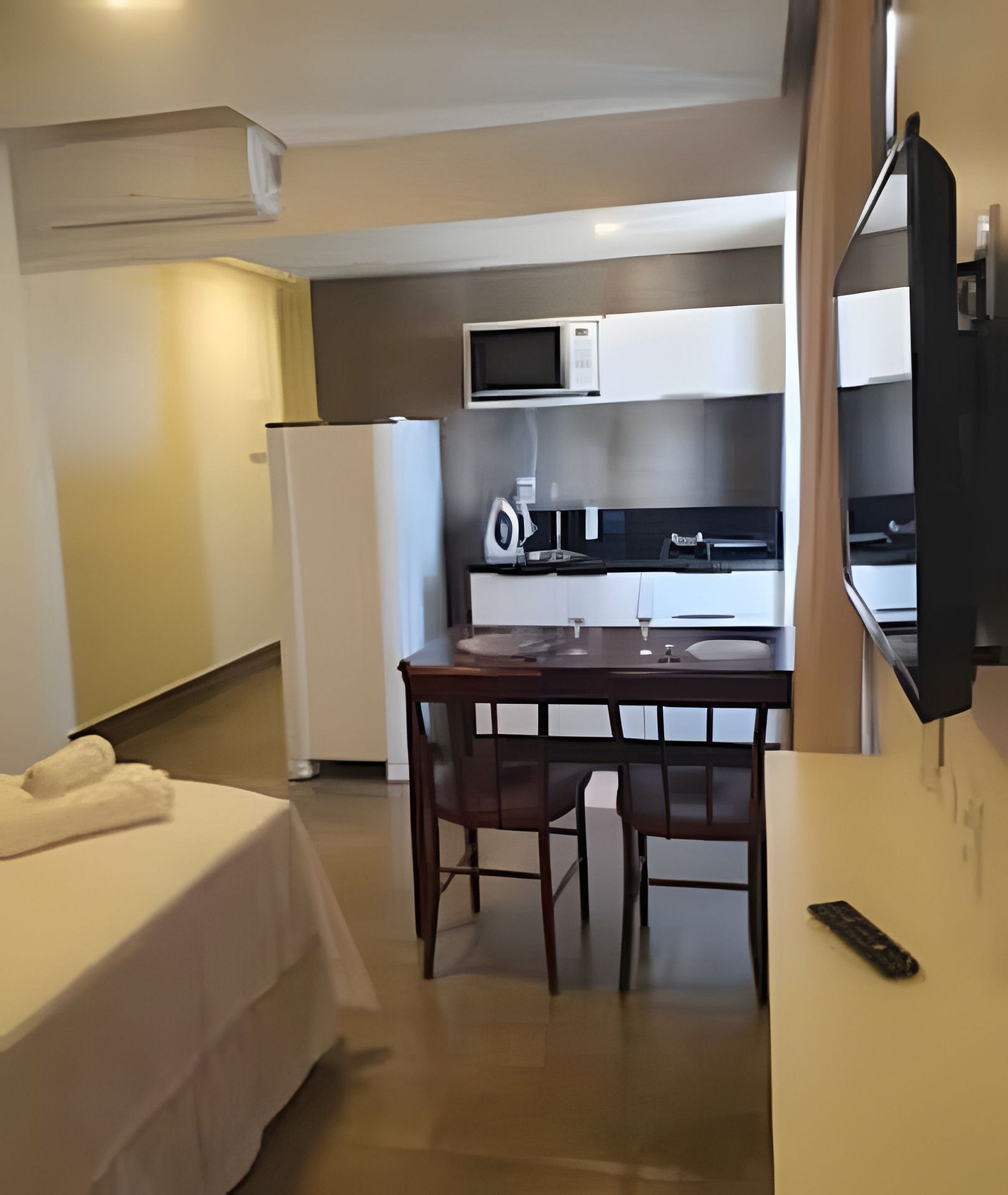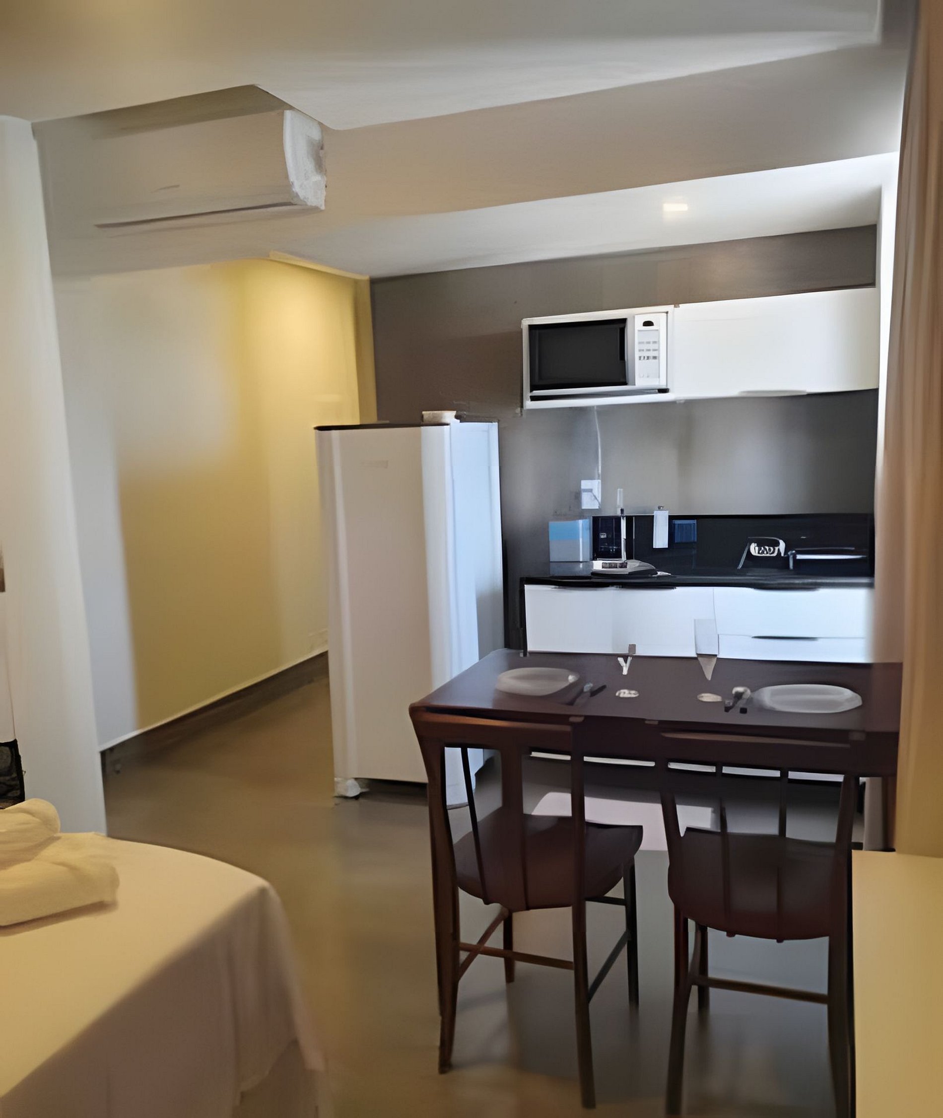 A cozinha compacta é equipada com frigobar, cooktop, micro-ondas, cafeteira e utensílios básicos, permitindo preparar pequenas refeições com praticidade. A bancada integrada com banquetas cria um espaço agradável para refeições rápidas ou home office.