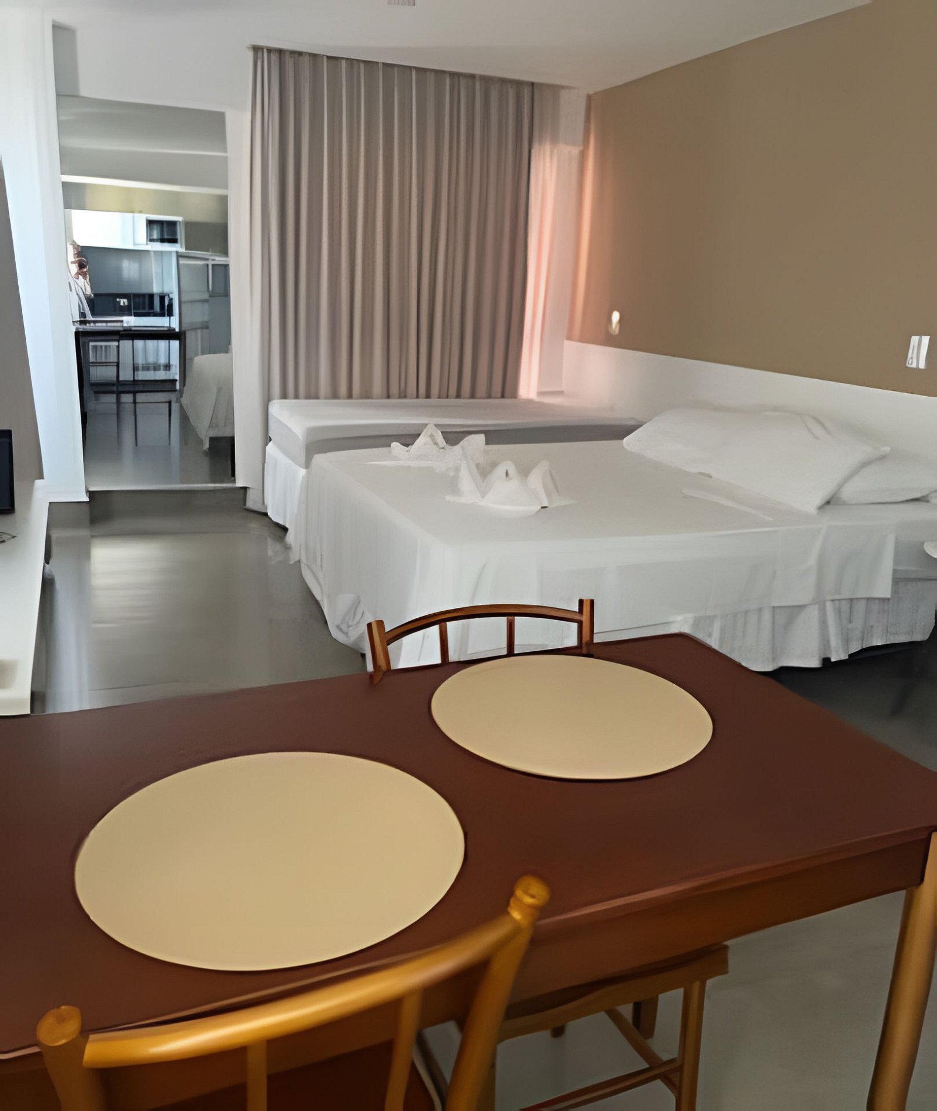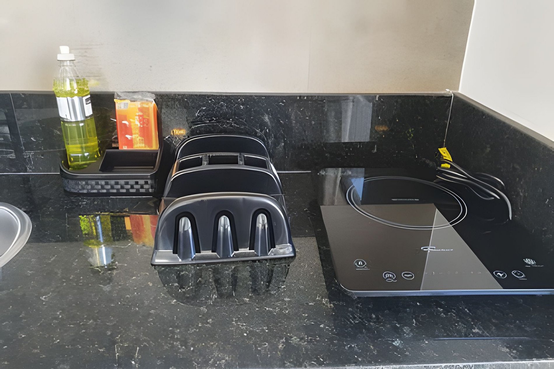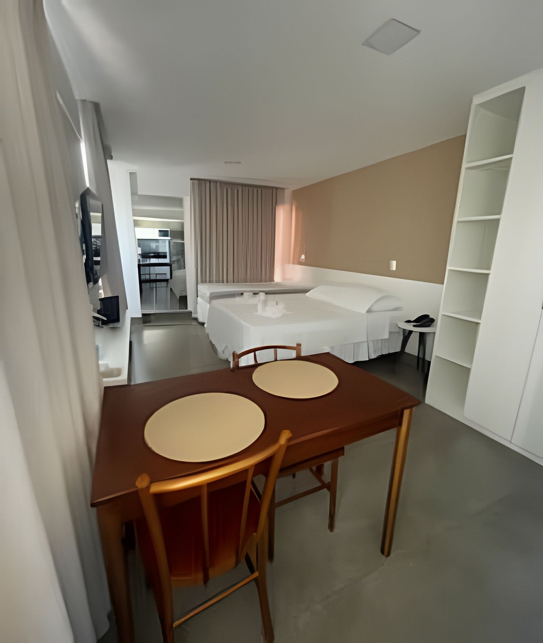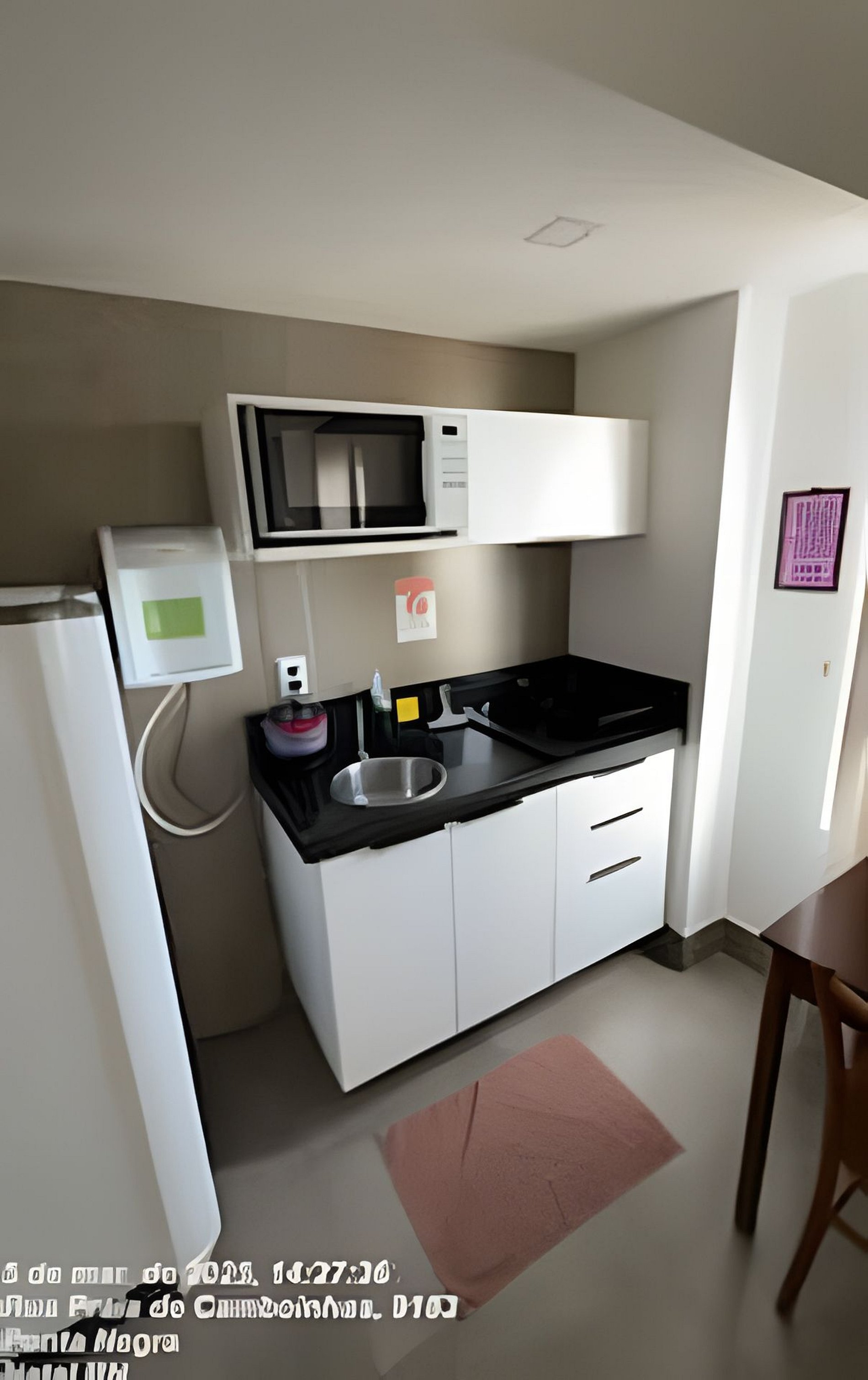 A cozinha compacta é equipada com frigobar, cooktop, micro-ondas, cafeteira e utensílios básicos, permitindo preparar pequenas refeições com praticidade. A bancada integrada com banquetas cria um espaço agradável para refeições rápidas ou home office.