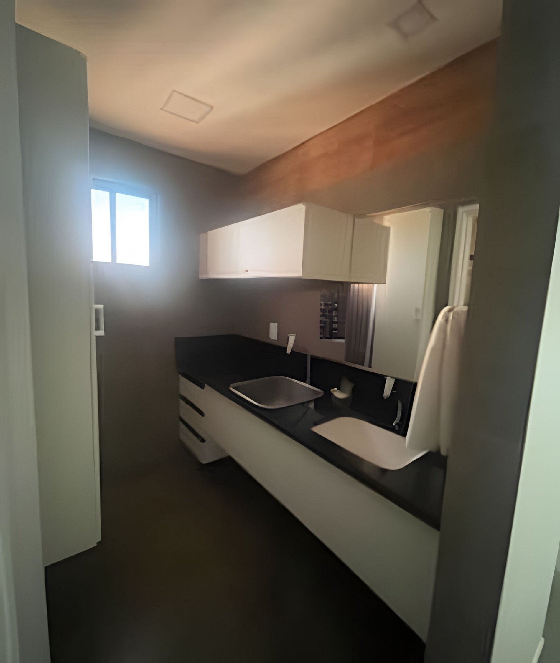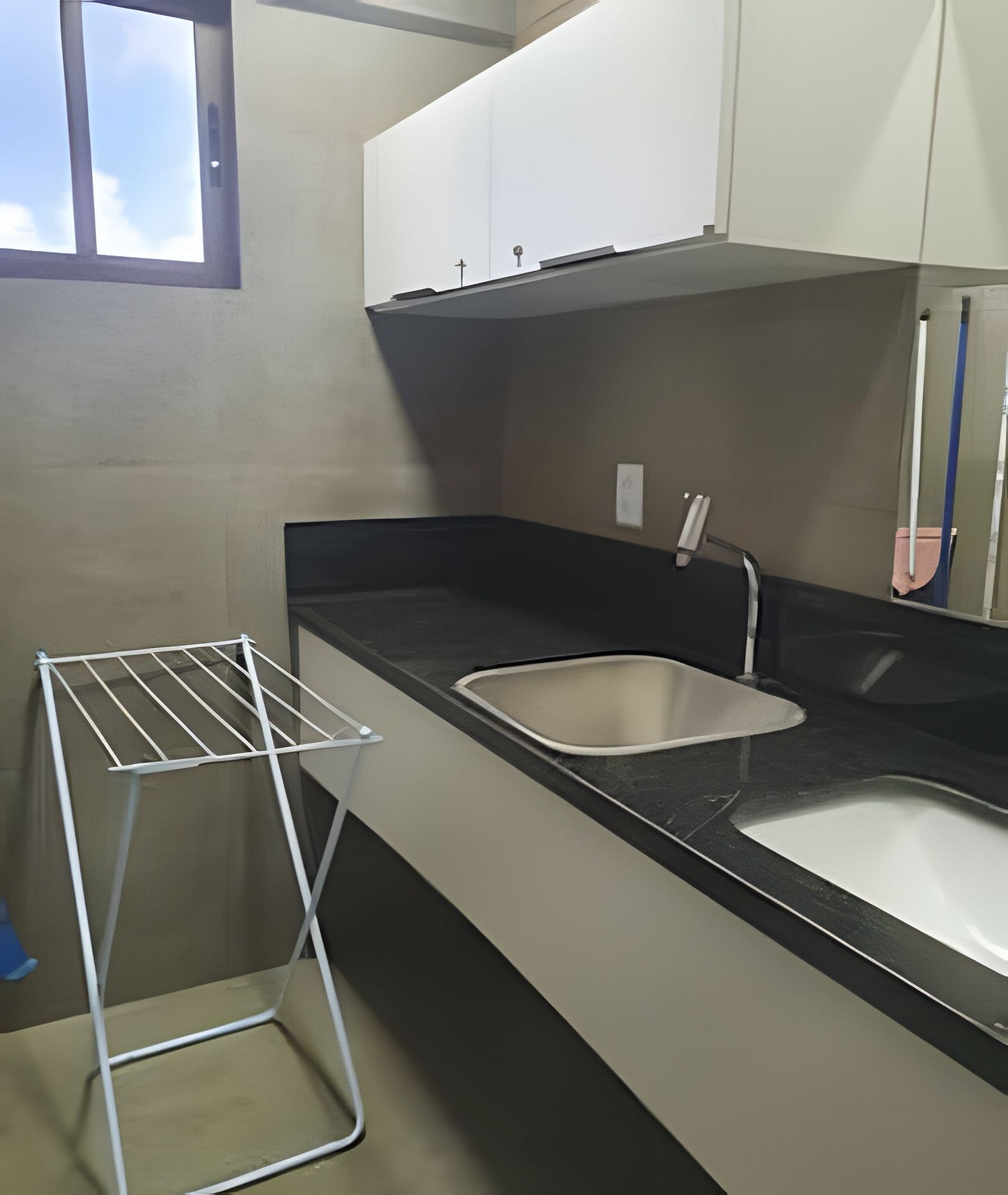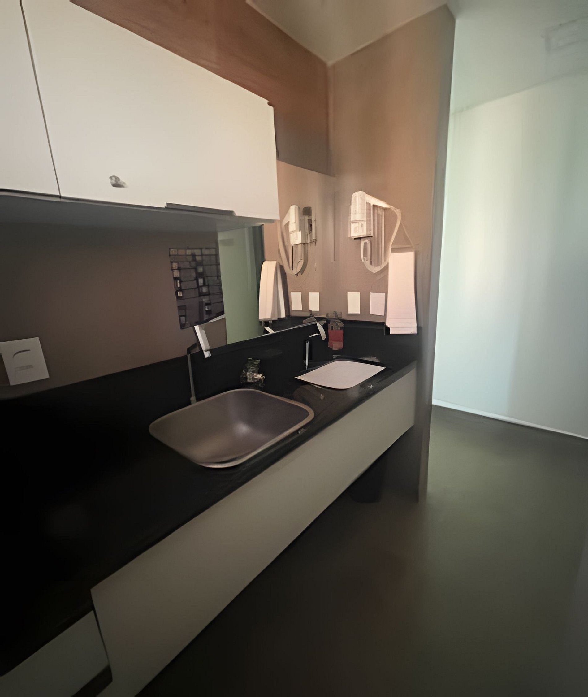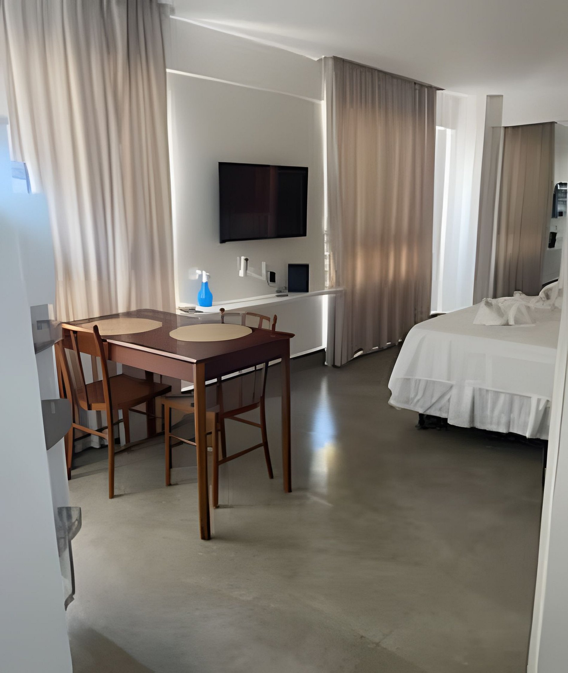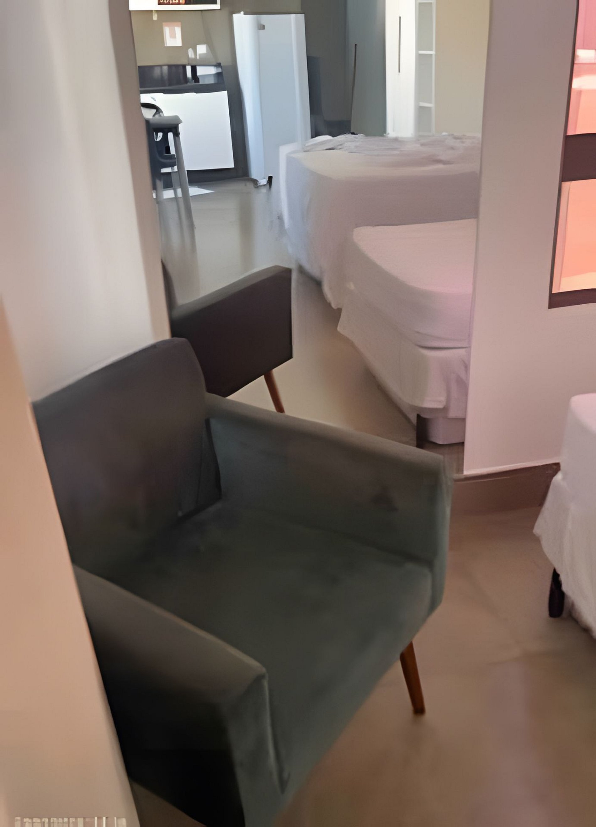 A cozinha compacta é equipada com frigobar, cooktop, micro-ondas, cafeteira e utensílios básicos, permitindo preparar pequenas refeições com praticidade. A bancada integrada com banquetas cria um espaço agradável para refeições rápidas ou home office.