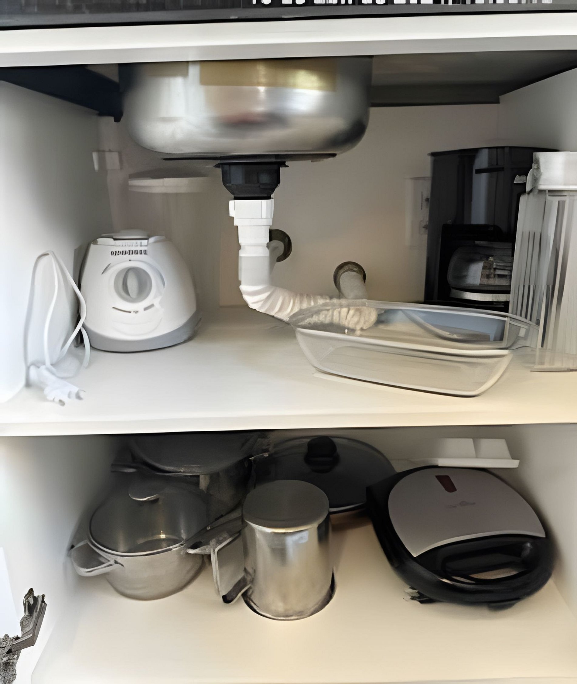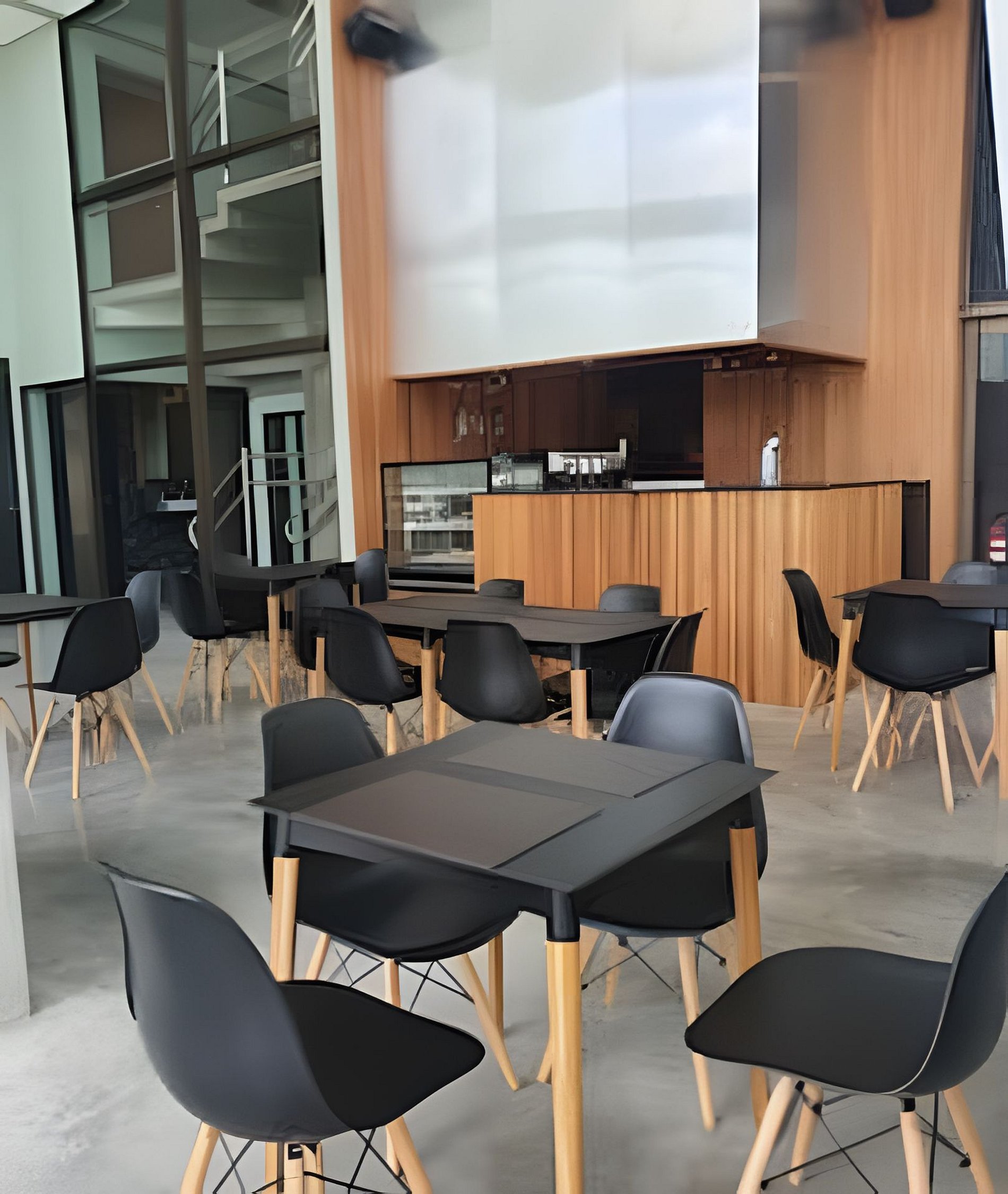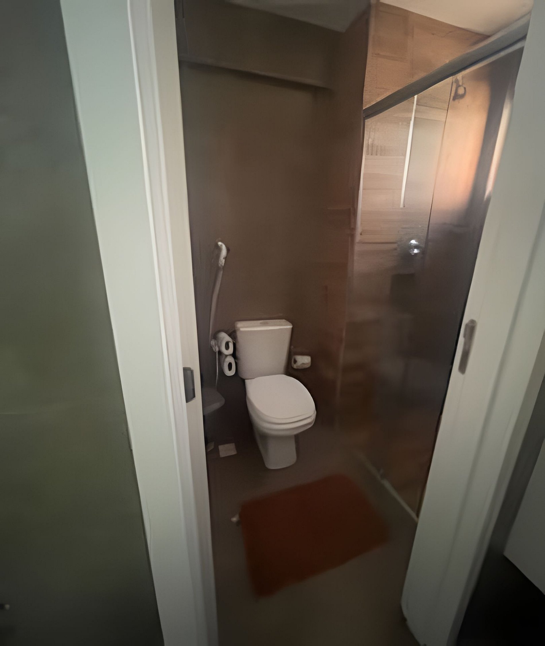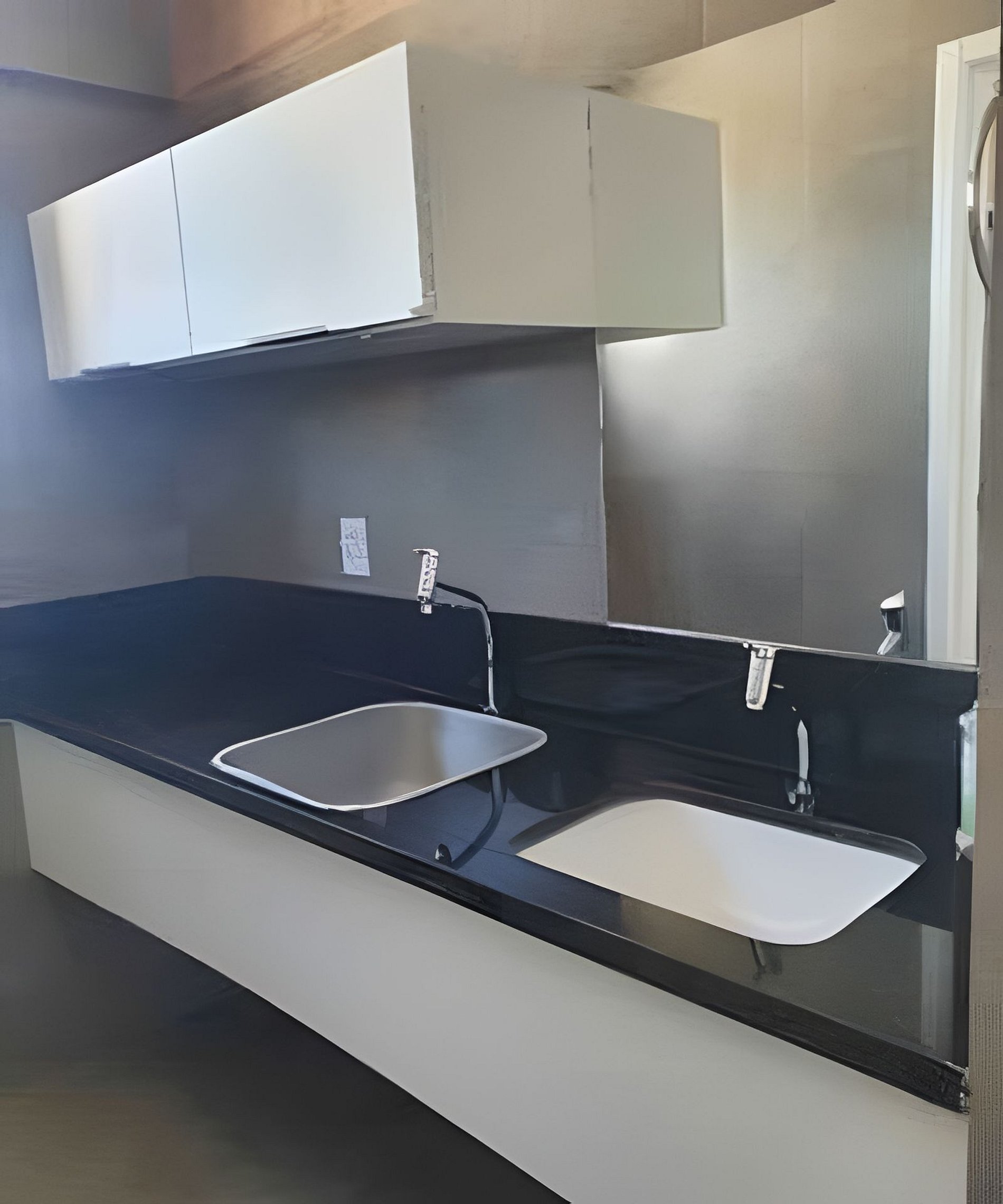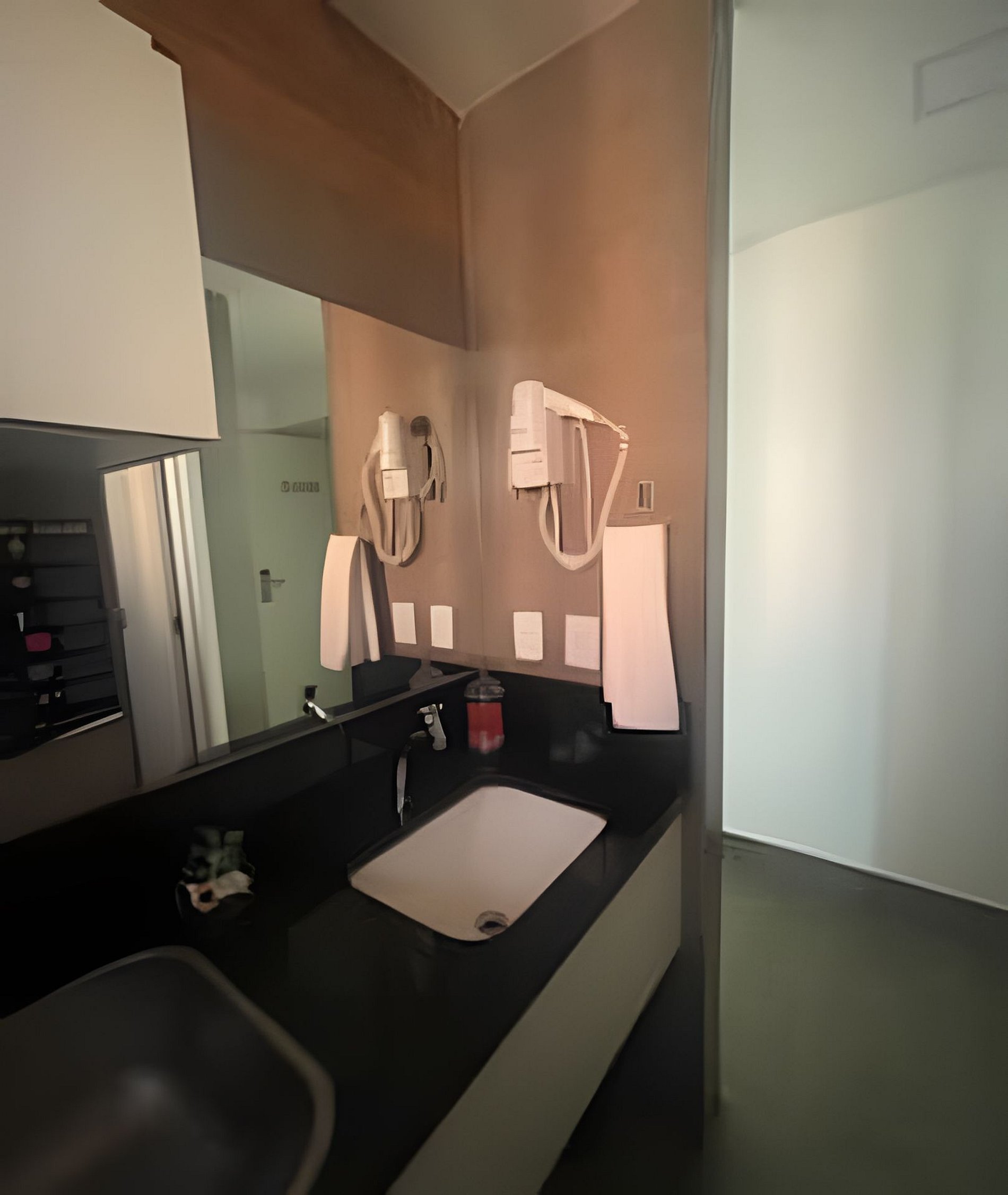 A cozinha compacta é equipada com frigobar, cooktop, micro-ondas, cafeteira e utensílios básicos, permitindo preparar pequenas refeições com praticidade. A bancada integrada com banquetas cria um espaço agradável para refeições rápidas ou home office.