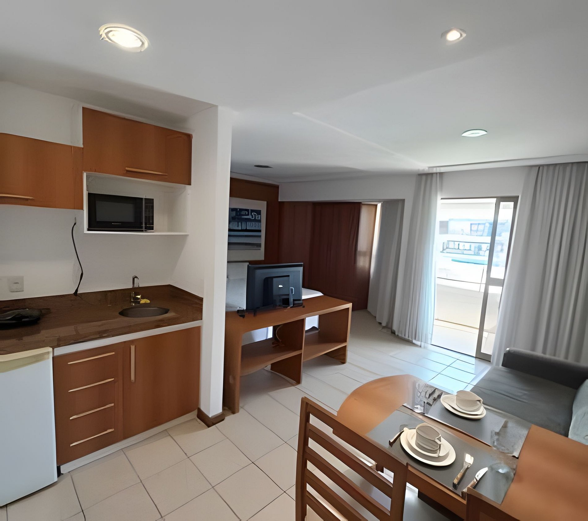 Cozinha compacta: Uma cozinha equipada para que você se sinta em casa, podendo preparar suas refeições com toda comodidade.